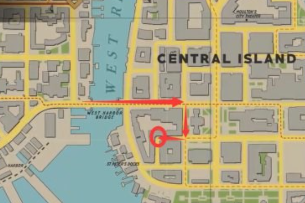这里可以不用按照导航路线去保利家,在和保利对话过后就直接带他过桥到中心岛(CENTRAL ISLAND)上的俱乐部去,找到小胡同里的蓝色招牌就是了。如果你这么做了,保利会非常高兴,你也可以解锁一个隐藏成就“有失高雅”。