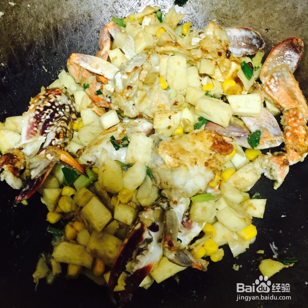 4/6锅中放少量油把葱姜蒜爆香,放入切好的冬笋块(冬笋要用盐开水焯一下,防止麻嘴)翻炒一下加入玉米粒和一小勺盐继续翻炒一分钟关火。