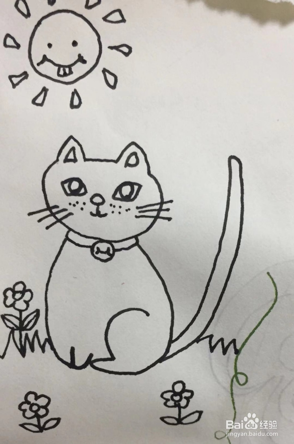 2/4在猫咪的脖颈处画出一个铃铛项圈,我们用笔画出猫咪的身体轮廓。用笔画出草地和花朵。红色闪光笔给猫咪的腮红上色,我们给猫咪的项圈上色,用笔给花朵上色。