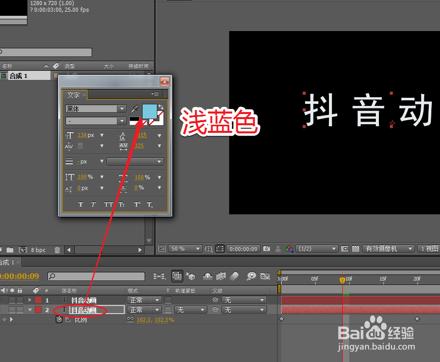 2/4选择底层的文字层,将字体它的颜色更改成蓝色。
