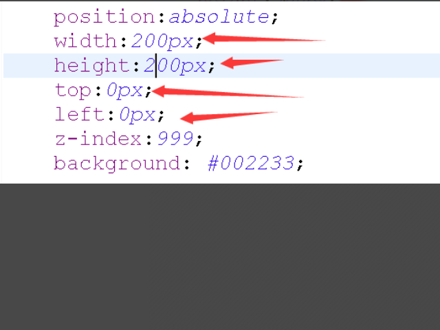 7、接下来,我们设置浮动div的位置,需要使用到的是top与left.具体如下图所示,同时,为了便于观察,我将悬浮的div的宽度与高度修改了。