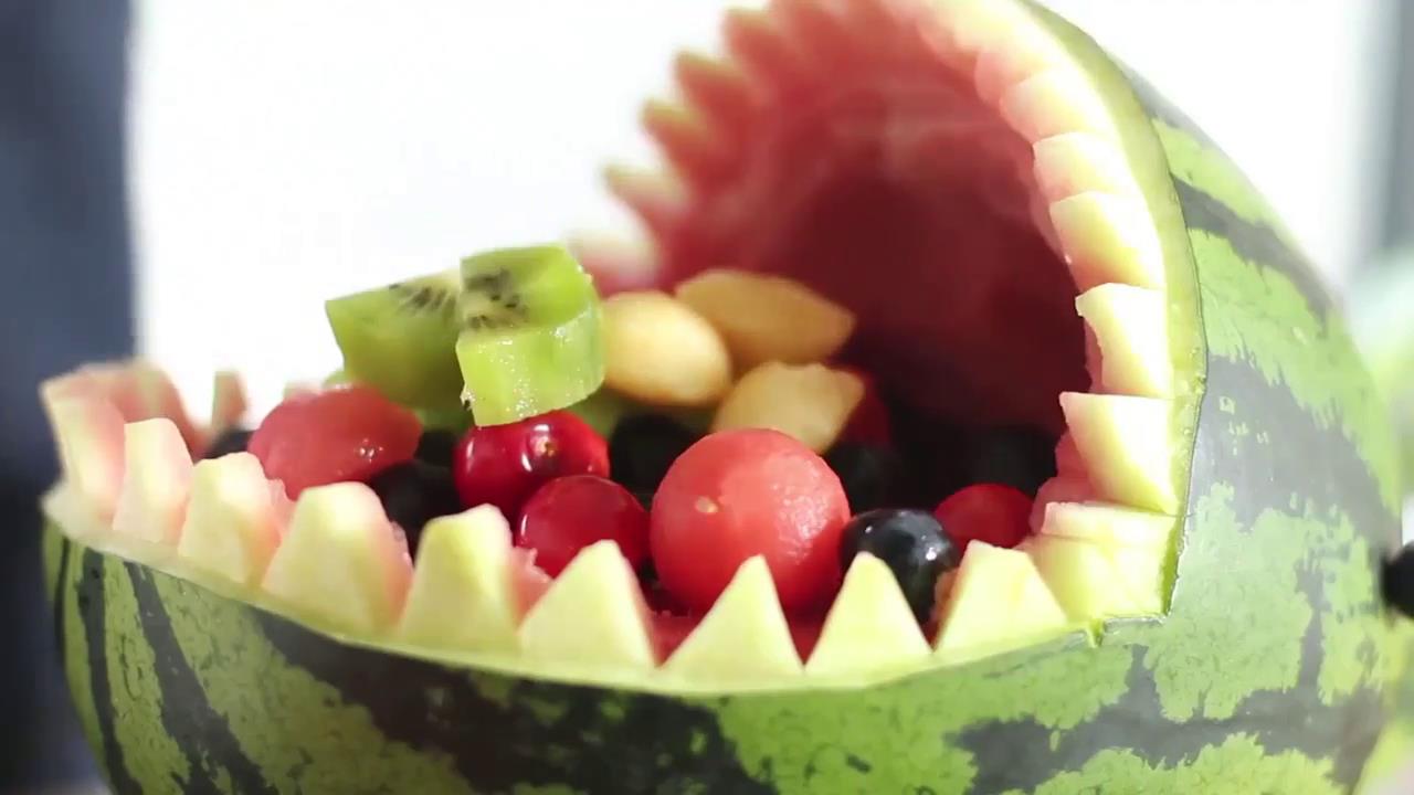 4/4把洗好的水果倒入西瓜鲨鱼的大嘴中即可。