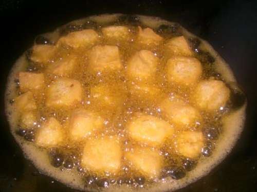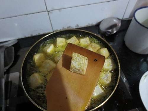 七、再次把炸好的豆腐再次倒披救称入油锅。