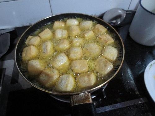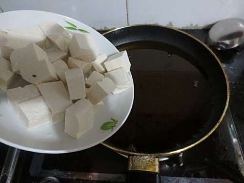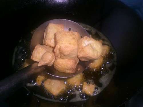 豆腐切块后油炸,炸两遍,控制油炸时间和温度。初炸油温宜控制在130~140℃之间,初炸时间一般控制在12-15分钟,一般豆腐坯在油中膨大浮起即可认为初炸完成。经初炸后的豆腐块转而进入高温油锅中定型,定型油温一般控制在170~180℃之间,油炸时间一般控制在5-8分钟。成品冷却后应该是表面金黄,体积较坯子膨大而有弹性,内部蜂敏腊窝状结构。油炸时用油量一般与豆腐坯的比例为4:1。