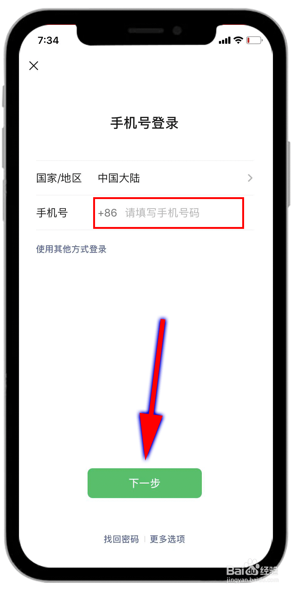 5/6填写登录的手机号码,点击“下一步”。
