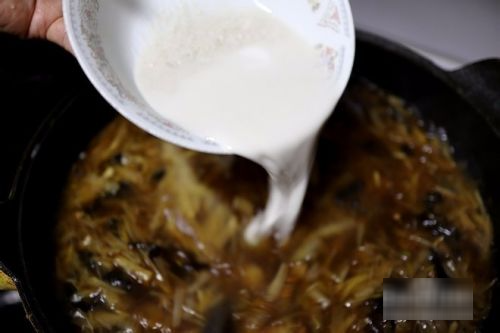 10、将淀粉糊倒入锅中,一边倒一边用勺子慢慢搅拌,使淀粉糊受热充分。
