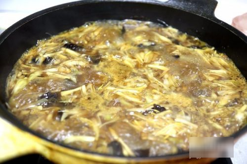 9、撒盐、倒适量酱油翻炒出香味,再倒入适量热水,大火煮开,使黄花菜煮至透明并散开;木耳丝也由脆变软。