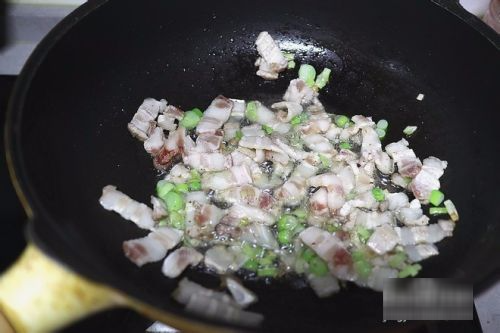 7、下面来打卤:炒锅中倒适量油,先净葱花和五花肉片入锅中,煸炒至肉片微卷,肉中的油脂被逼出来。