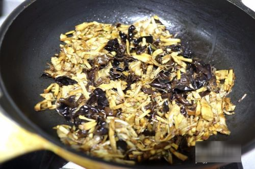 8、将黄花菜入锅中,充分吸引油脂变得油润;再将木耳丝倒入锅中翻炒。