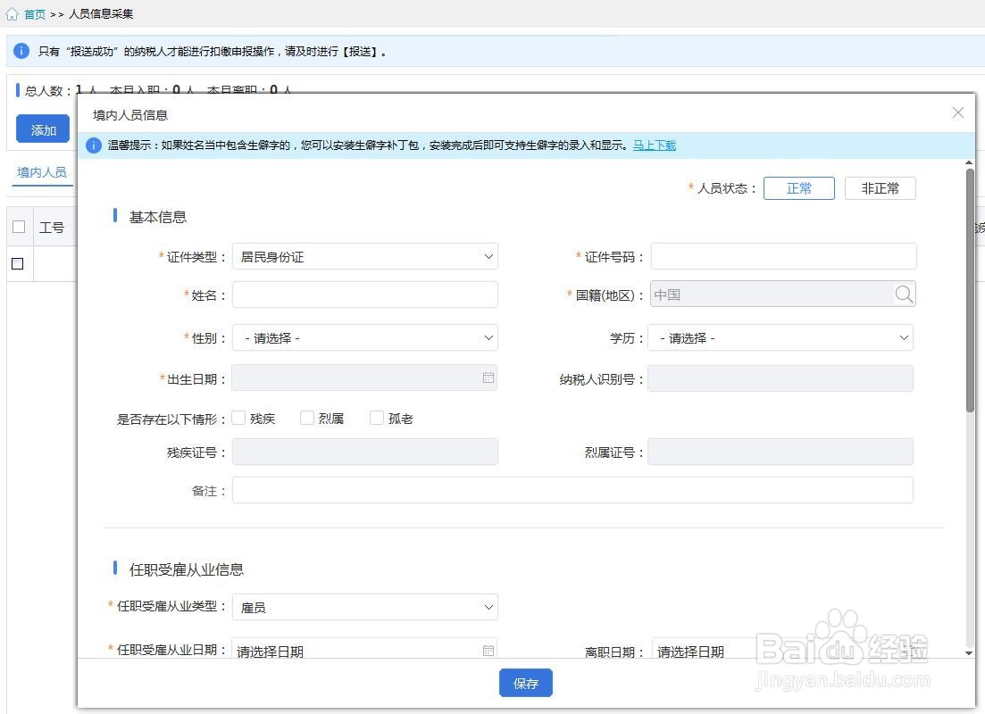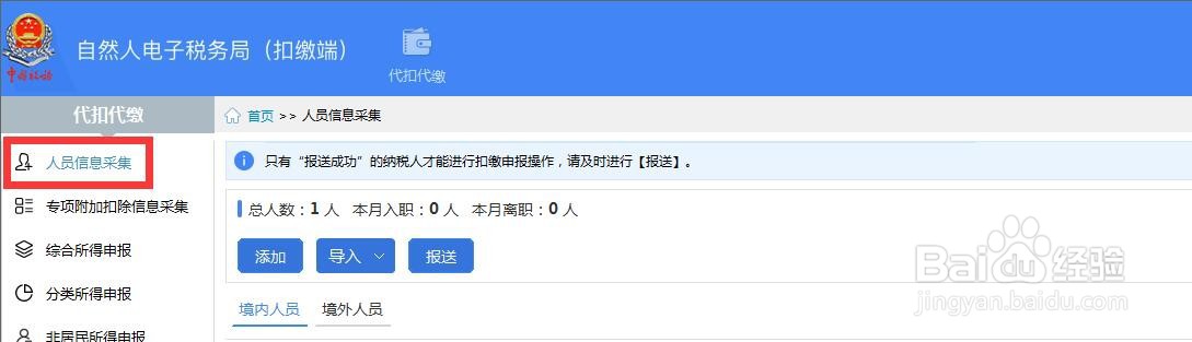 2/5选择左侧栏的人员采集信息,然后选择添加。添加法人的信息就可以了