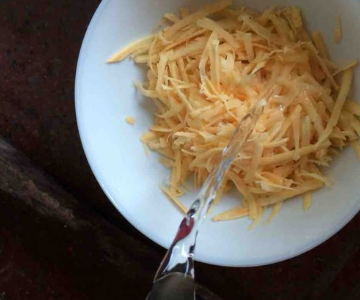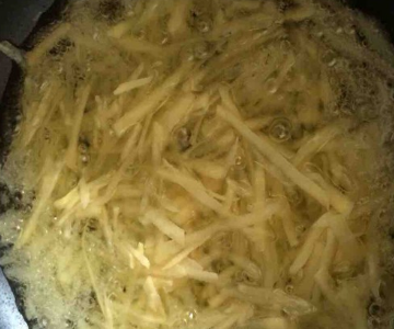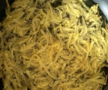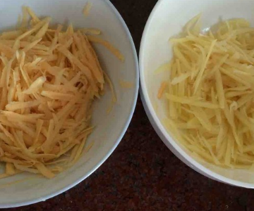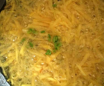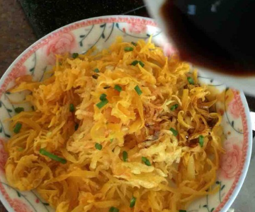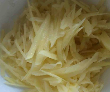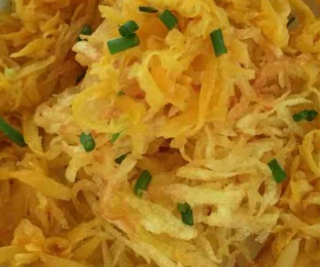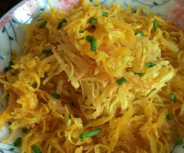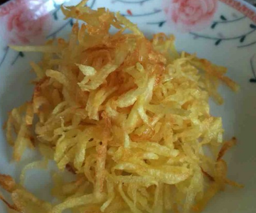 10、地瓜捞起,围着土豆丝放,再加上一小团地瓜丝放到土豆上,撒点葱花。