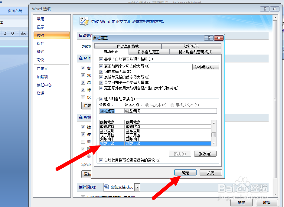 6/7添加的更正词语就进入到下面的列表中,我们在此表中还可以进行“删除”操作。如图,依次点击几个确定按钮。