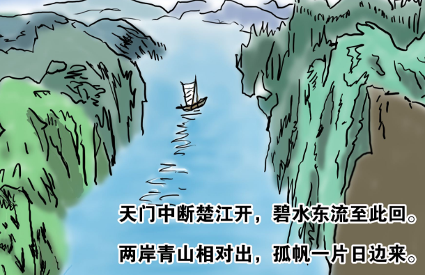 诗中用了六个动词“断、开、流、回、出、来”,山水景物呈现出跃跃欲出的动态,描绘了天门山一带的雄奇阔远。一、二句写出了天门山水雄奇险峻不可阻遏的气势,给人惊心动魄之感;三、四句写足也写活了浑阔茫远的水势。
