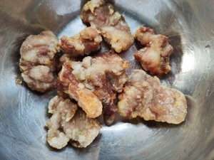 8,放入事先腌制好的荔枝肉炸至金黄。