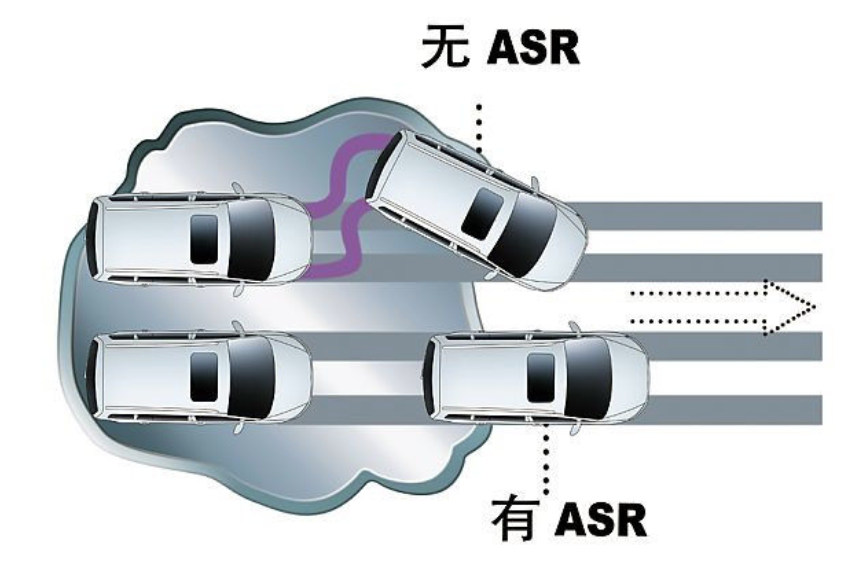 当汽车行驶在易滑的路面上时,没有ASR的汽车加速时驱动轮容易打滑,如果是后驱动轮打滑,车辆容易甩尾,如果是前驱动打滑,车辆方向容易失控。有ASR时,汽车在加速时就不会有或能够减轻这种现象。在转弯时,如果发生驱动轮打滑会导致整个车辆向一侧偏移,当有ASR时就会使车辆沿着正确的路线转向。