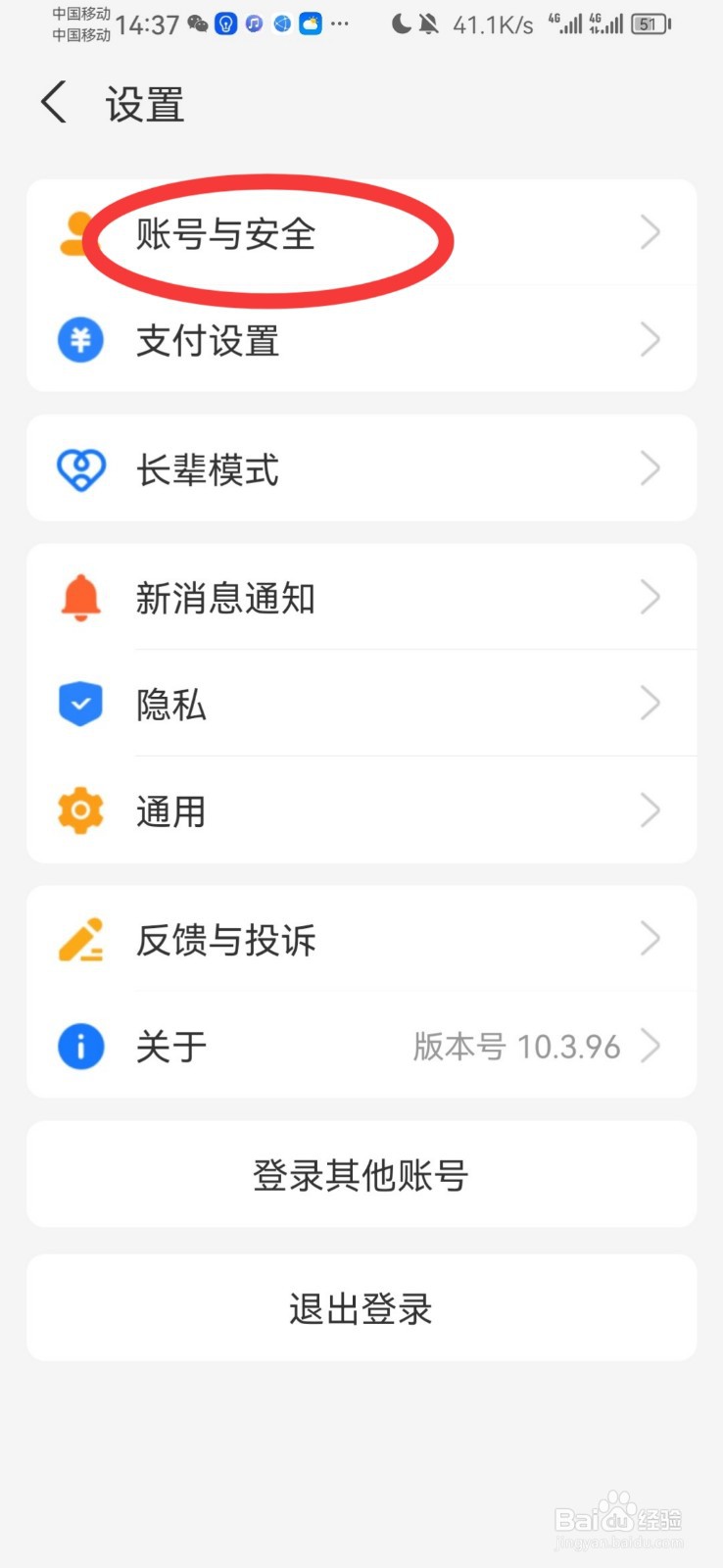 2/4进入设置页面,点击【账号与安全】。