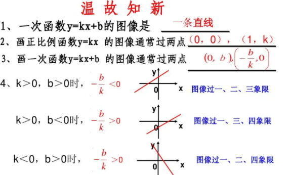(2)描点:一般取两个点,根据“两点确定一条直线”的道理,即在直角坐标系中,以自变量的值为横坐标,相应的函数值为纵坐标,描出表格中数值对应的各点。一般地,y=kx+b(k≠0)的图象过(0,b)和(-b/k,0)两点即可画出。