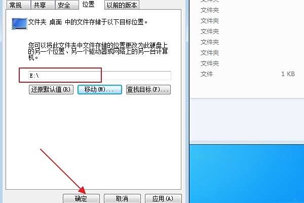7、在弹出的设置选项对话框中就可以看到桌面的新的存储位置已经变为E盘,点击确定后进入下一步,如下图所示。