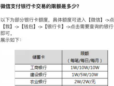 6、在页面中找到【微信支付银行卡交易的限额是多少】这个问题,点击进入后,就会出现各个银行卡的交易限额列表。