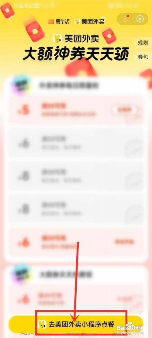 2/5进入到外卖红包领取页,点击页面底部“去美团外卖小程序点餐”。