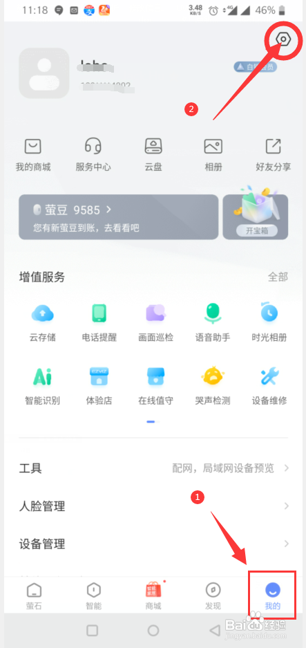 登录萤石云视频手机APP,在“我的”页签,点击右上角的设置图标;