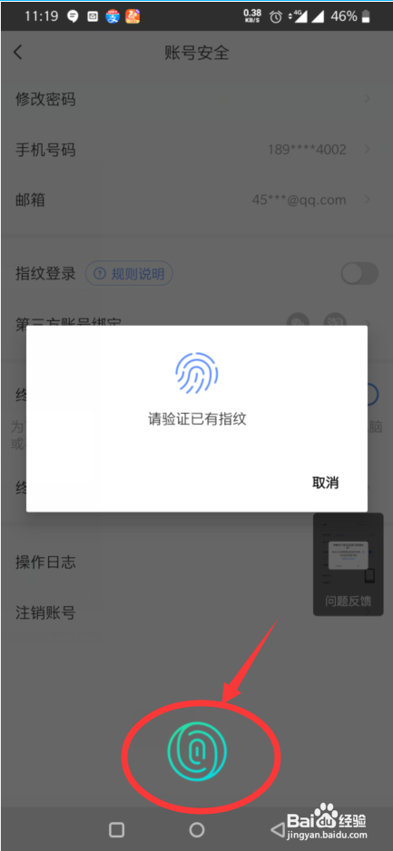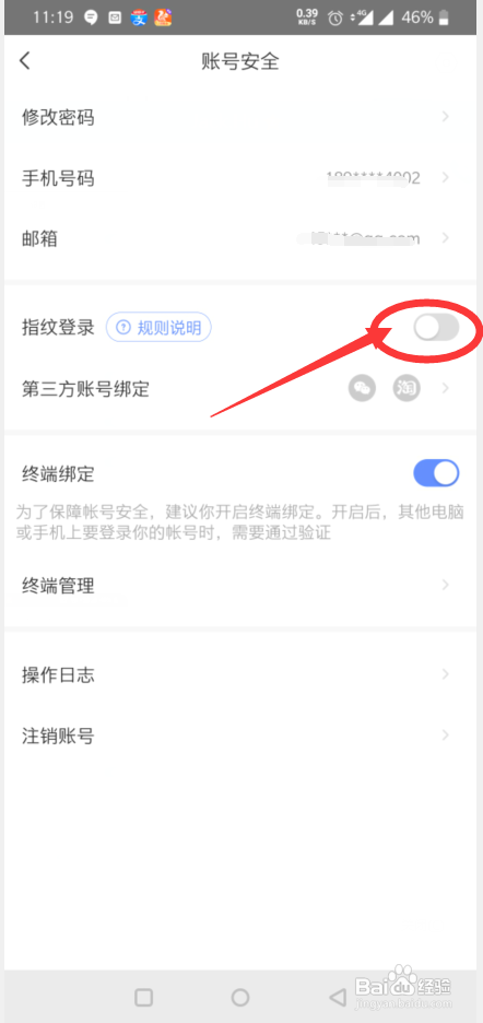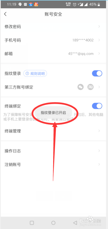 2/4点击“账号安全”,打开“指纹登录”右侧开关;