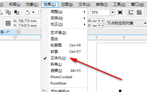 2、画好矩形后,点击工具栏中的效果,然后点击选择立体化。