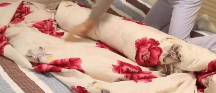 5、然后,把卷起来的棉被展开,同时把最开始对折的棉被拉出,如下图所示。