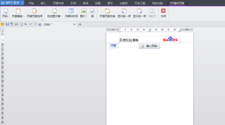 1、点击上方菜单栏里的【插入】功能键,找到【页眉和页脚】选项并点击,此时进入编辑页眉页脚界面,如下图所示。