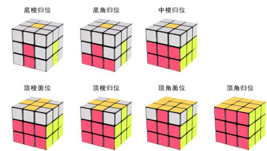 三阶魔方最常见的就是按照七步还原法进行还原,还原的时候按照顶层十字、底棱归位、底角归位、棱块归位、顶棱面位、顶角面位、顶棱归位、顶角归位的步骤进行的。