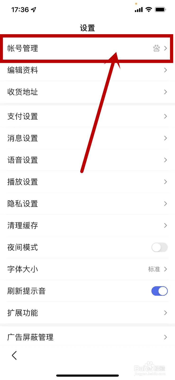 2/4进入百度设置页面中,点击上方“账号管理”设置。