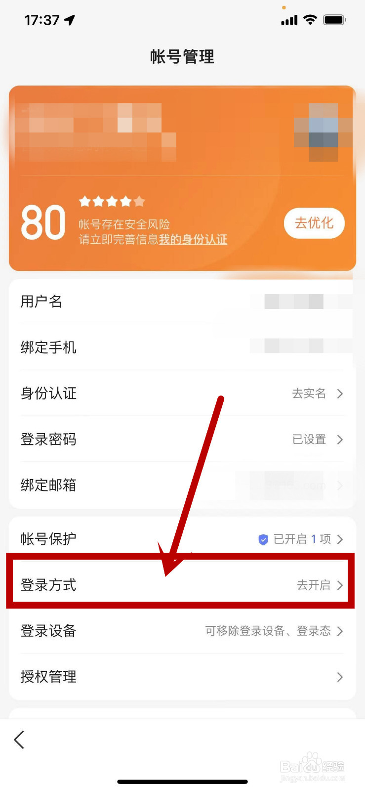 3/4进入自己的百度账号管理页面,点击下方登录方式。