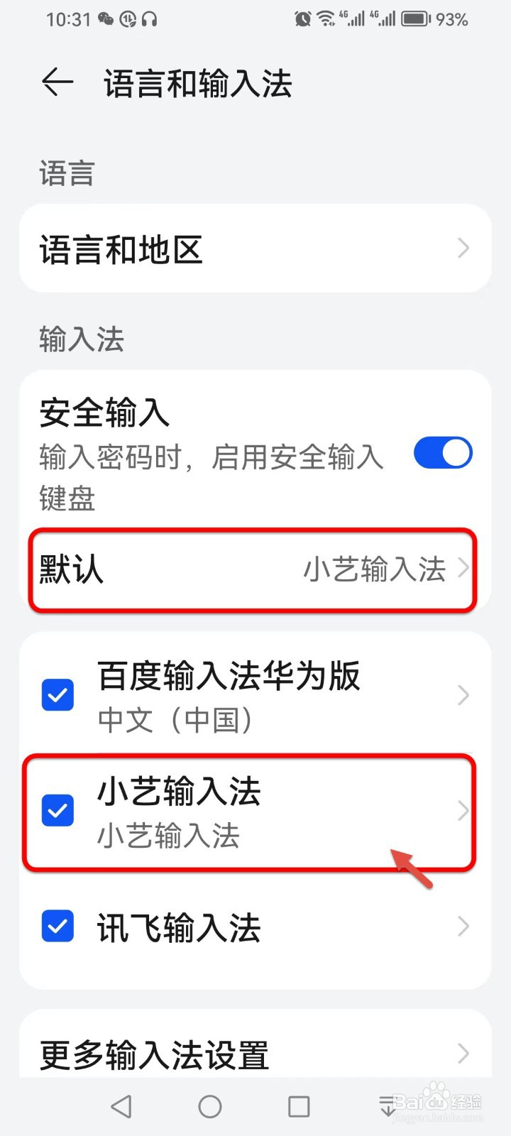 进入语言和输入法界面,点击默认的【小艺输入法】