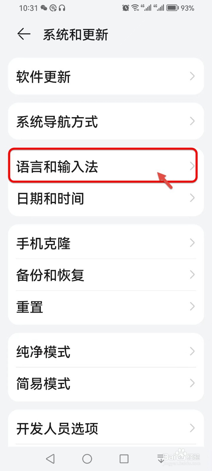 进入系统和更新界面,点击【语言和输入法】