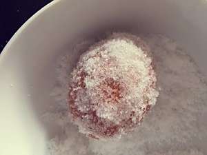 2、每个鸡蛋在盐粒里面打个滚儿。