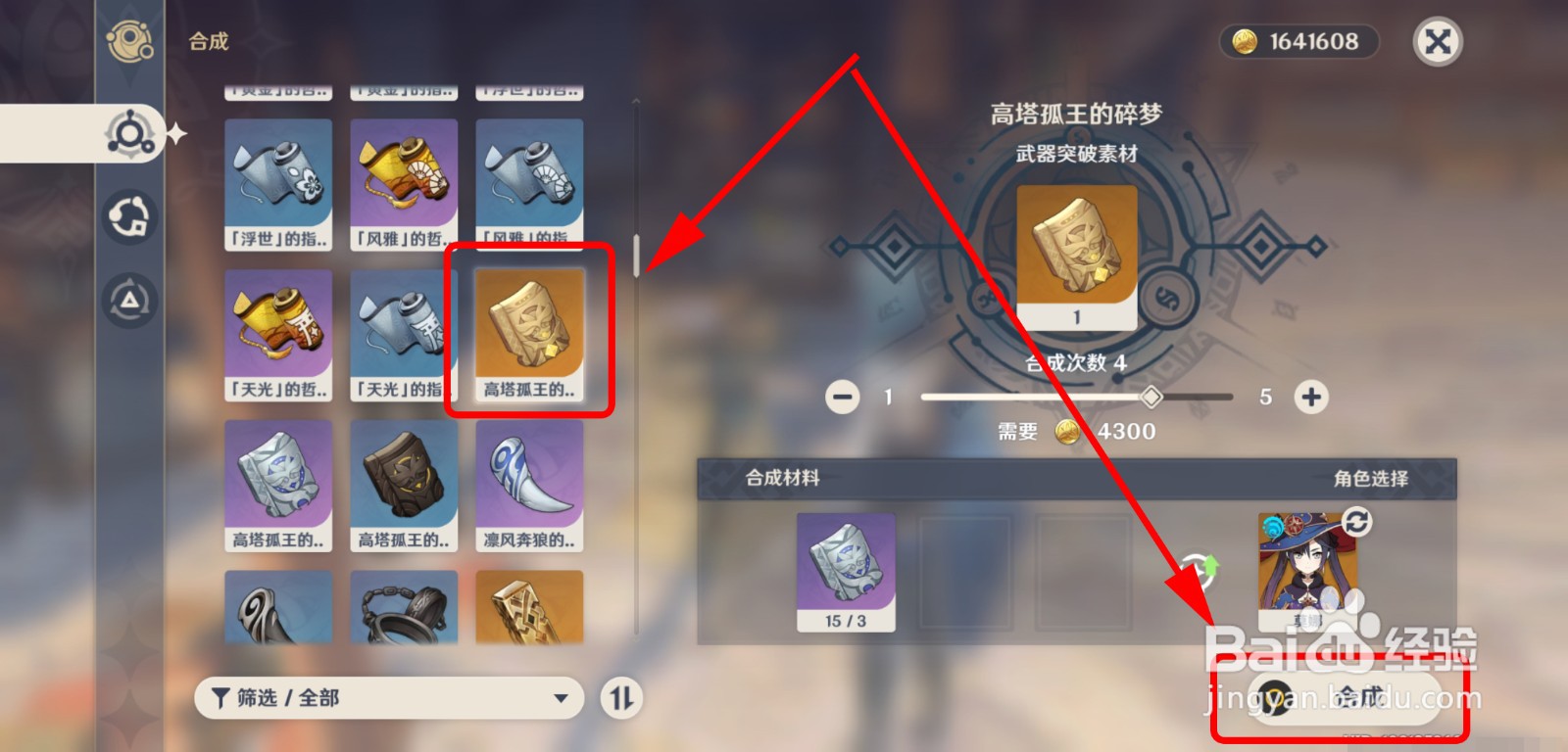《原神》中某些武器突破需要素材——高塔孤王的碎梦。下面,我给大家演示一下,怎么合成高塔孤王的碎梦。