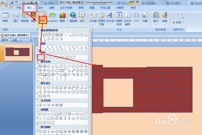 插入——形状——矩形——用矩形画砖的形状——颜色填充暗红色