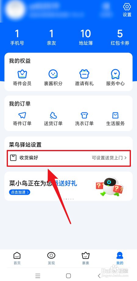 在菜鸟“我的”界面,点击“收货偏好”所在行,如图所示