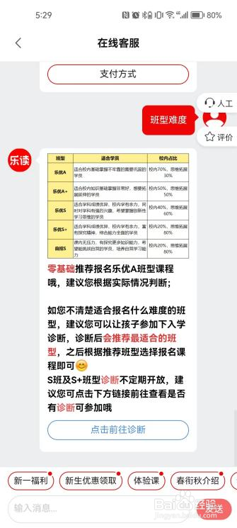 3.如果选择长期课程,点击右下角客服,里面有班型难度说明,也可以做下测试,来测试下孩子适合哪个班级