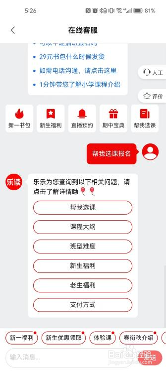 4.进入客服入口后,点击菜单“帮我选课”,然后点击“班型难度说明”,就可以查看每个班型适合什么水平的孩子