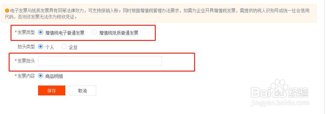 在发票申请页面选择自己需要的发票,建议是电子发票,方便保存。然后填写自己的发票信息,点击保存即可。