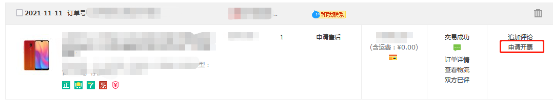 找到买到手机的订单,点击右边的申请开票按钮。