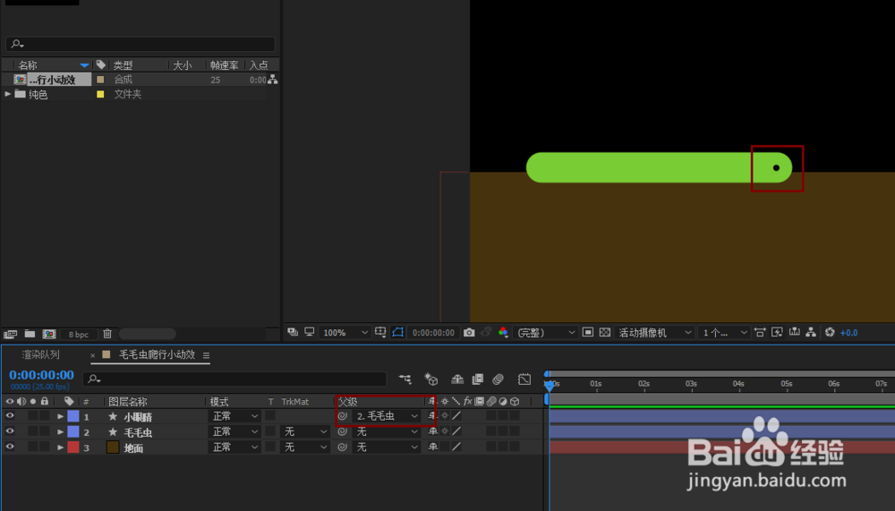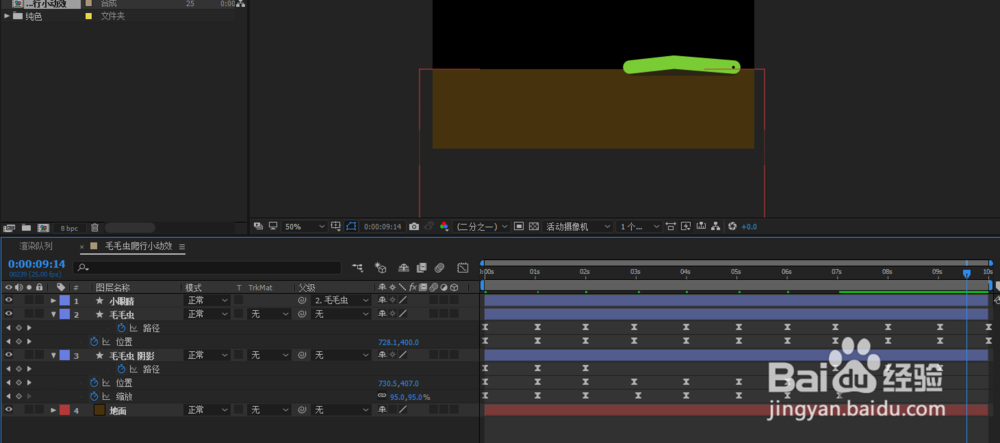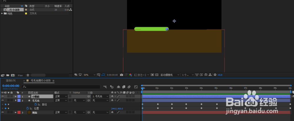 给毛毛虫的位置和路径K关键帧,完成一个身体爬行前进的效果。路径用钢笔工具去调整一个弯曲的效果。
