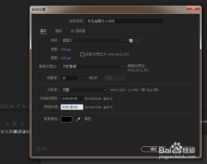 打开AE软件,命名毛毛虫爬行小动效,调整相应的参数。