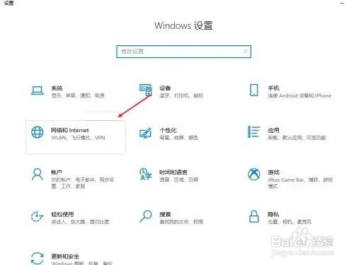1、第一步在电脑桌面左下角处点击【开始】图标,点击设置,点击网络和internet选项。