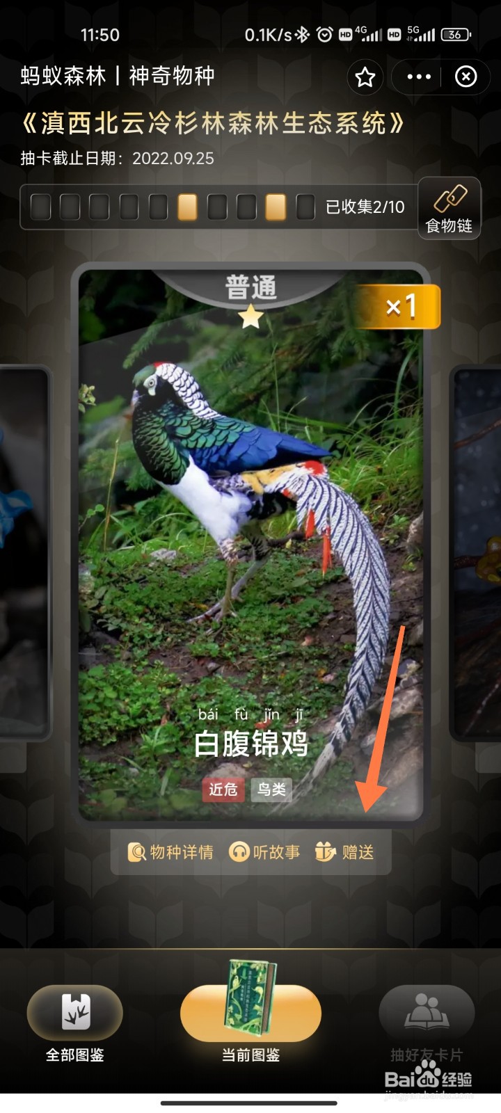本文介绍在蚂蚁森林中如何将神奇物种卡赠送,以下是赠送物种卡的具体的操作步骤: