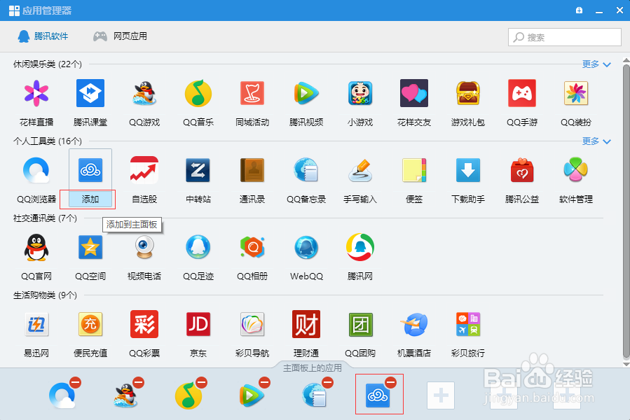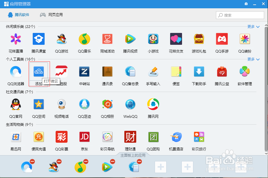 在应用管理器界面,鼠标放在微云上面不动,会显示添加,点击添加会把图标添加到主面板。