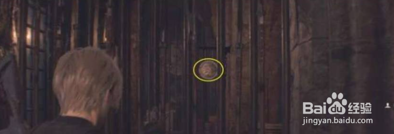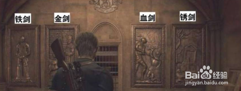 然后去4个画框里,再把金剑,铁剑,锈剑回收,按照如图顺序放上去,从左往右铁剑,金剑,血剑,锈剑。出去的门,专家难度在觐见厅2楼,通过吊灯跳到对面,开门的蛇在背后如图位置,攻击后阿什莉会开另一个。