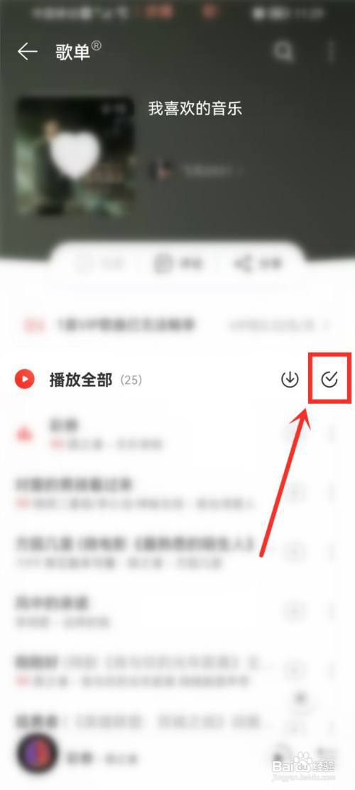 进入歌单详情页,点击“播放全部”右侧“√”。如下图。