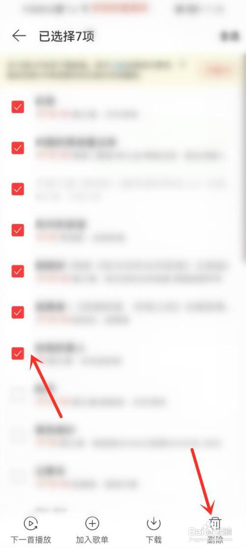 勾选要删除的歌曲,然后点击底部“删除”。如下图。